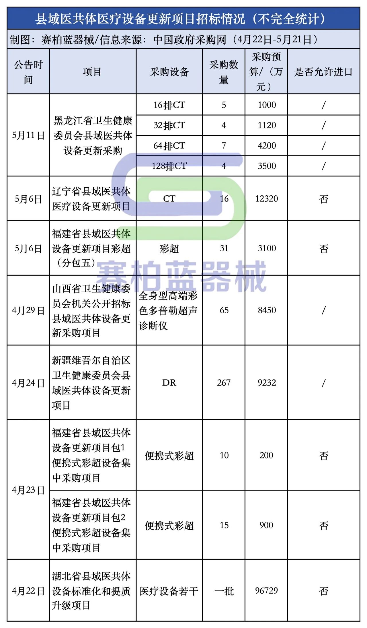 2025年將是醫療設備市場的重要爆發期。據賽柏藍器械梳理,近一個月內,黑龍江、遼寧、福建、新疆、山西、湖北等多地開展縣域醫共體采購項目招標,招標預算超14億元。