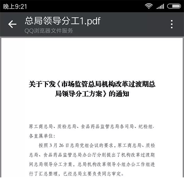 昨天,一份命名為《總局領(lǐng)導(dǎo)分工1.PDF》文件截圖在微信上流傳,疑似涉及新組建的國(guó)家市場(chǎng)監(jiān)管總局領(lǐng)導(dǎo)分工安排流出。