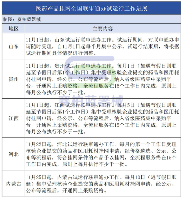 醫(yī)藥產(chǎn)品掛網(wǎng)全國(guó)聯(lián)審?fù)ㄞk試運(yùn)行工作進(jìn)展及各地受理時(shí)間安排如下: