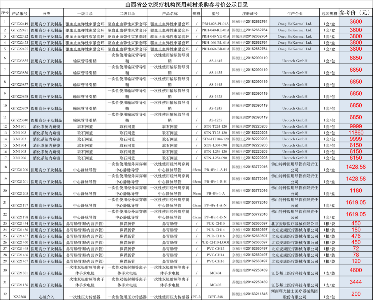 2、32種高值耗材價(jià)格公布