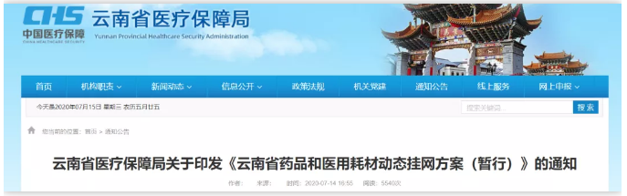 7月14日,云南省醫療保障局印發《云南省藥品和醫用耗材動態掛網方案(暫行)》(下稱《暫行方案》),明確要求將執行國家耗材帶量采購價格。