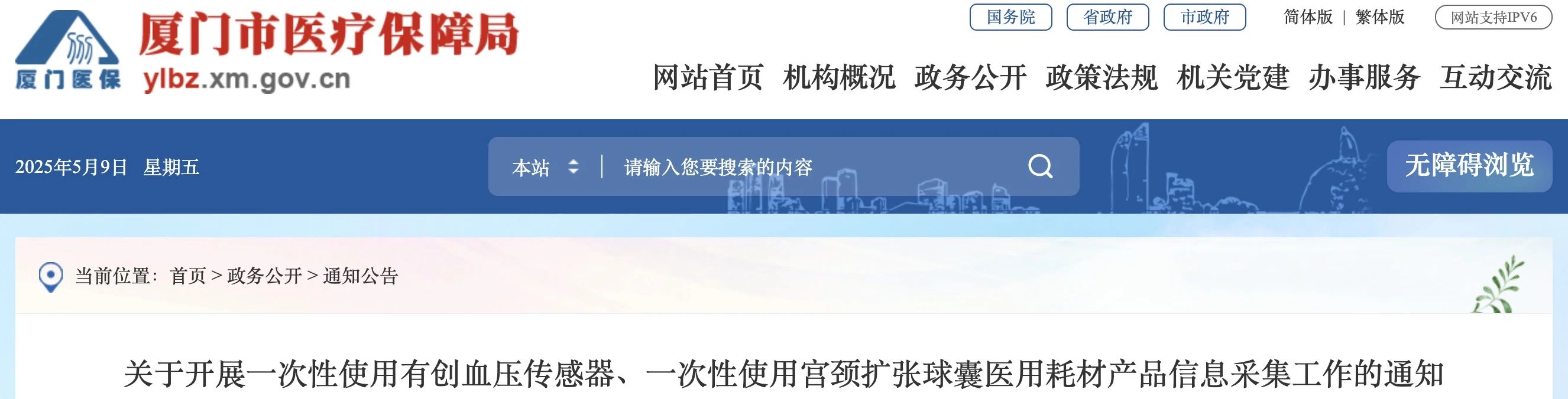 今日(5月9日),福建省廈門市醫(yī)保局發(fā)布《關(guān)于開展一次性使用有創(chuàng)血壓傳感器、一次性使用宮頸擴(kuò)張球囊醫(yī)用耗材產(chǎn)品信息采集工作的通知》,信息維護(hù)時間為2025年5月12日08:00至5月20日17:00。