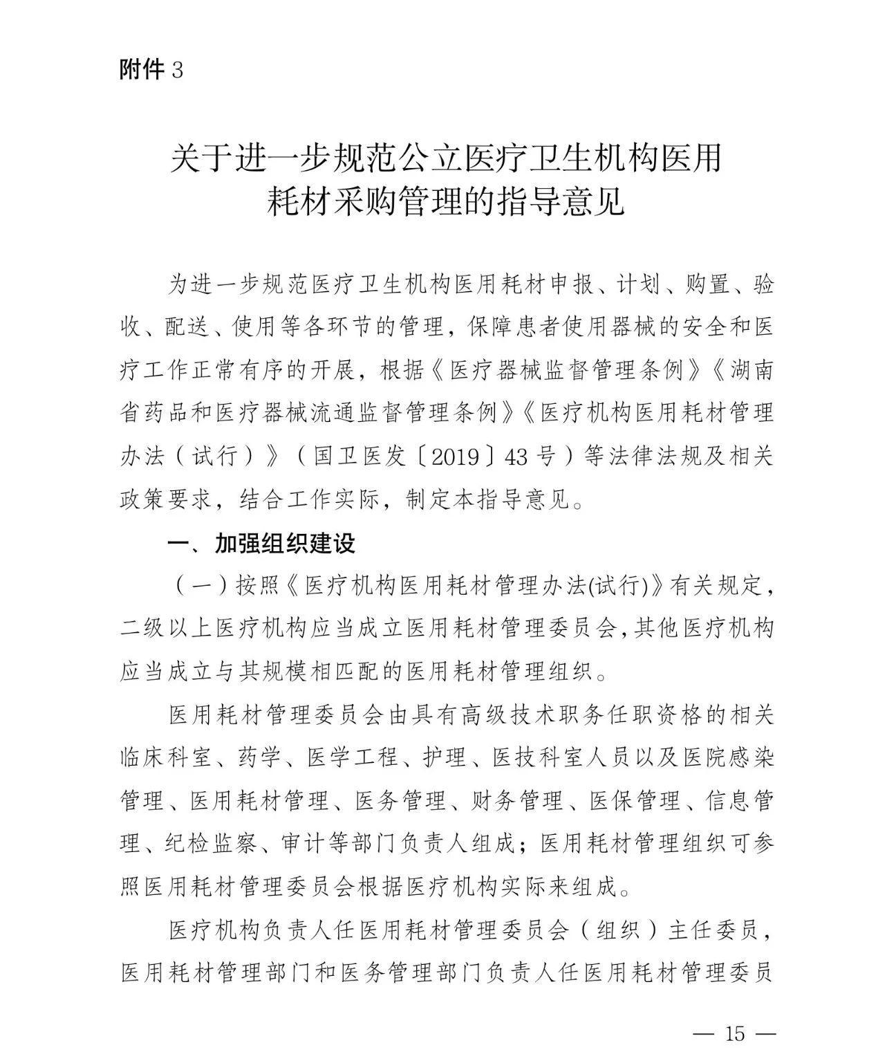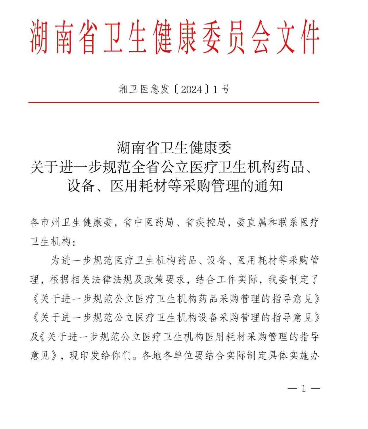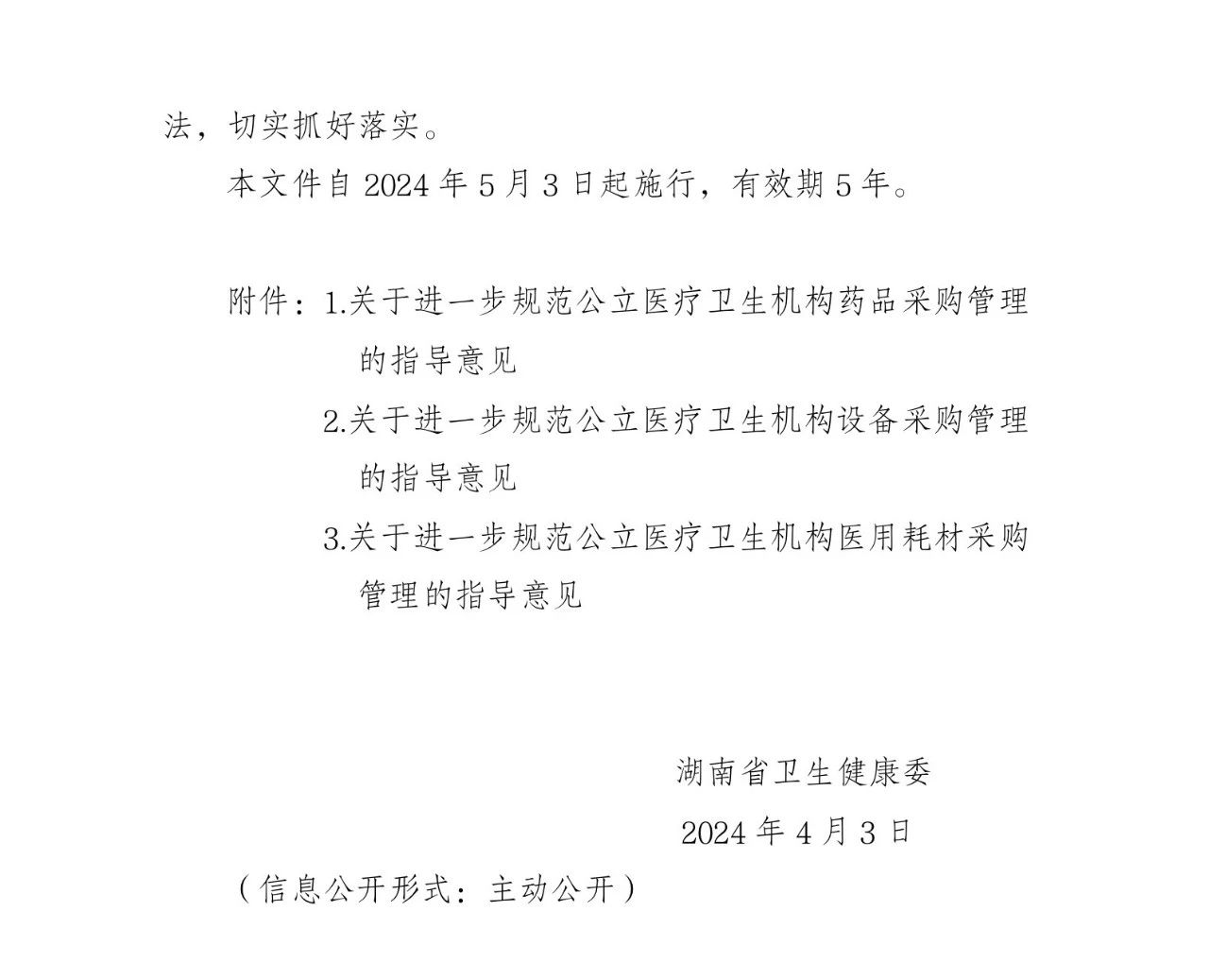 湖南省衛(wèi)健委分別制定了《關于進一步規(guī)范公立醫(yī)療衛(wèi)生機構(gòu)藥品采購管理的指導意見》《關于進一步規(guī)范公立醫(yī)療衛(wèi)生機構(gòu)設備采購管理的指導意見》及《關于進一步規(guī)范公立醫(yī)療衛(wèi)生機構(gòu)醫(yī)用耗材采購管理的指導意見》。