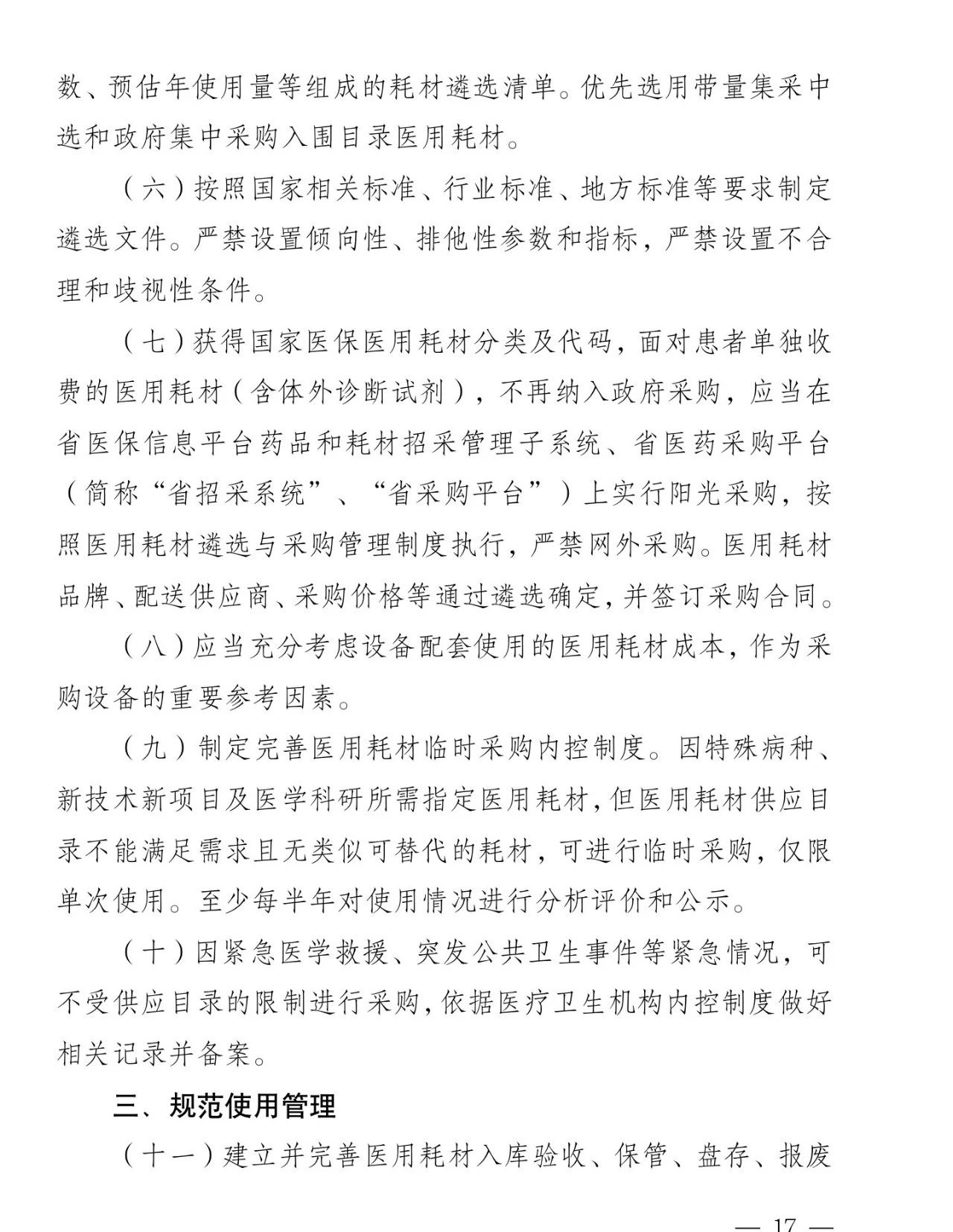 《指導意見》還明確,獲得國家醫(yī)保醫(yī)用耗材分類及代碼,面對患者單獨收費的醫(yī)用耗材(含體外診斷試劑),不再納入政府采購,應當在省醫(yī)保信息平臺藥品和耗材招采管理子系統(tǒng)、省醫(yī)藥采購平臺上實行陽光采購,按照醫(yī)用耗材遴選與采購管理制度執(zhí)行,嚴禁網(wǎng)外采購。