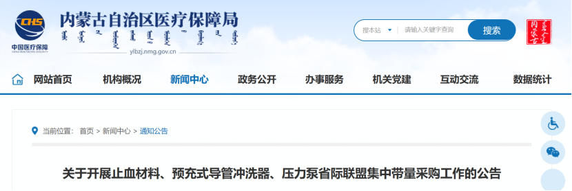 據華招器械網消息,今年2月,相關人士透露,內蒙古醫療保障局正在籌備對止血材料、預充式導管沖洗器、輸液器、注射器、輸液敷貼、吸氧管、采血管、霧化吸入器、高壓注射器、壓力泵、腔靜脈濾器等11類耗材的量采工作,已經給相關省(區)發送了關于邀請參加止血材料等11類醫用耗材省際聯盟集中帶量采購的函。