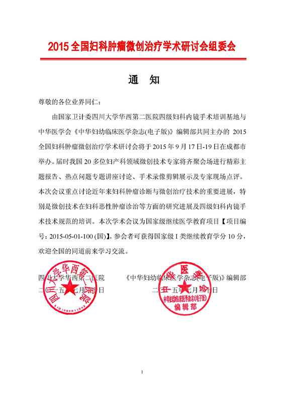- 第七屆婦科腫瘤研討會暨第二屆國際婦科及婦科腫瘤微創和綜合治療進展研討會2015-08-26