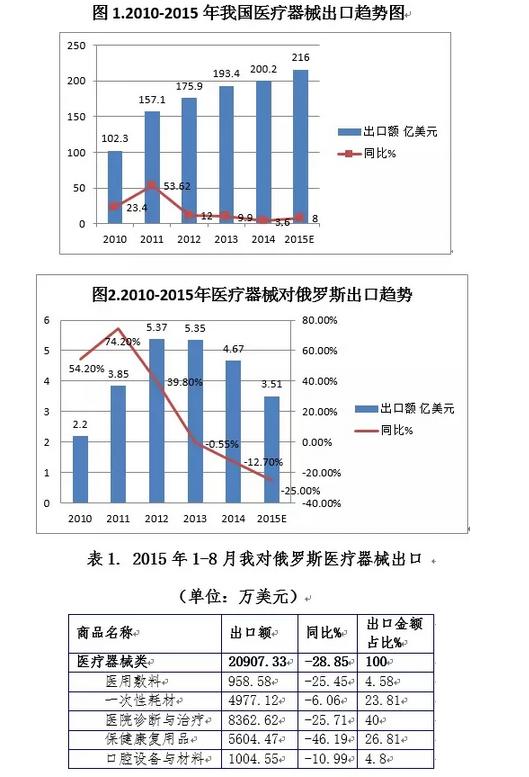 俄羅斯是我國醫療器械出口的主要市場之一,且近幾年增速迅猛,截止到2013年,我對俄醫療器械出口達到5.35億美元。但是從2014年開始,俄羅斯受政治經濟環境影響,市場出現較大波動,需求量明顯減少,我對俄醫療器械產品出口大幅下跌。2015年更為嚴重,1-8月我對俄出口醫療器械僅2.09億美元,同比下降28.85%(見表1)。我會預計今年全年同比將下降25%,回落到2011年的出口水平(見圖2)。