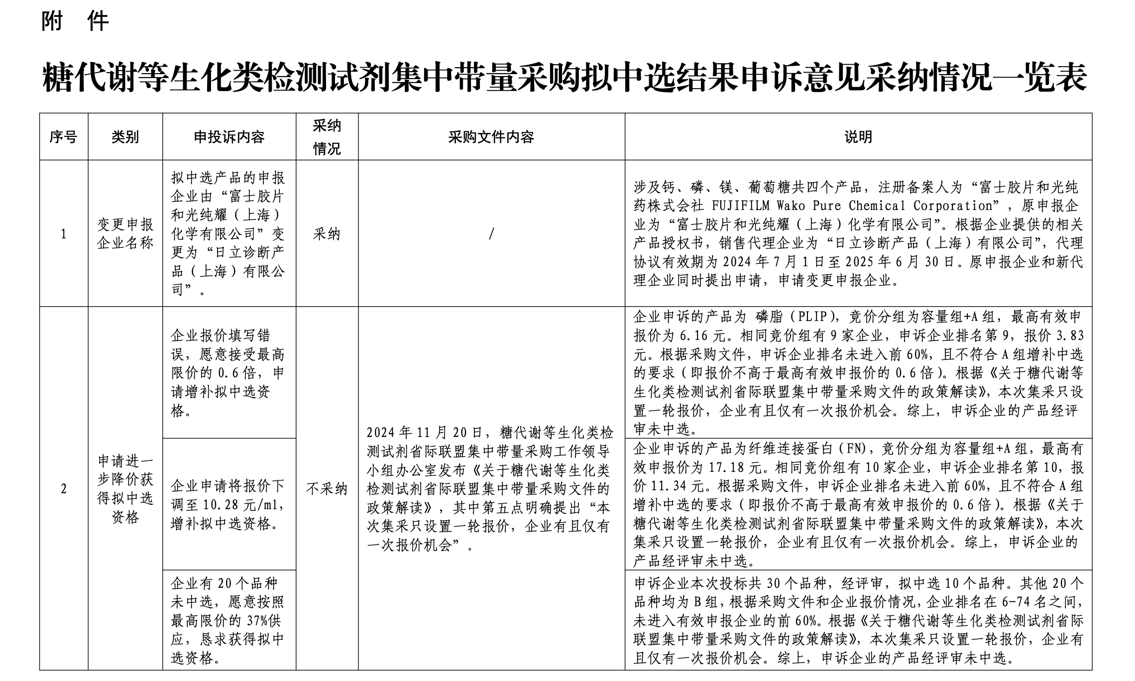 1月2日,江西醫(yī)保局發(fā)布《關(guān)于公布糖代謝等生化類(lèi)檢測(cè)試劑省際聯(lián)盟集中帶量采購(gòu)中選結(jié)果的通知》。同日,官方還對(duì)擬中選結(jié)果公示期間收到的申訴意見(jiàn)采納情況予以公開(kāi)。