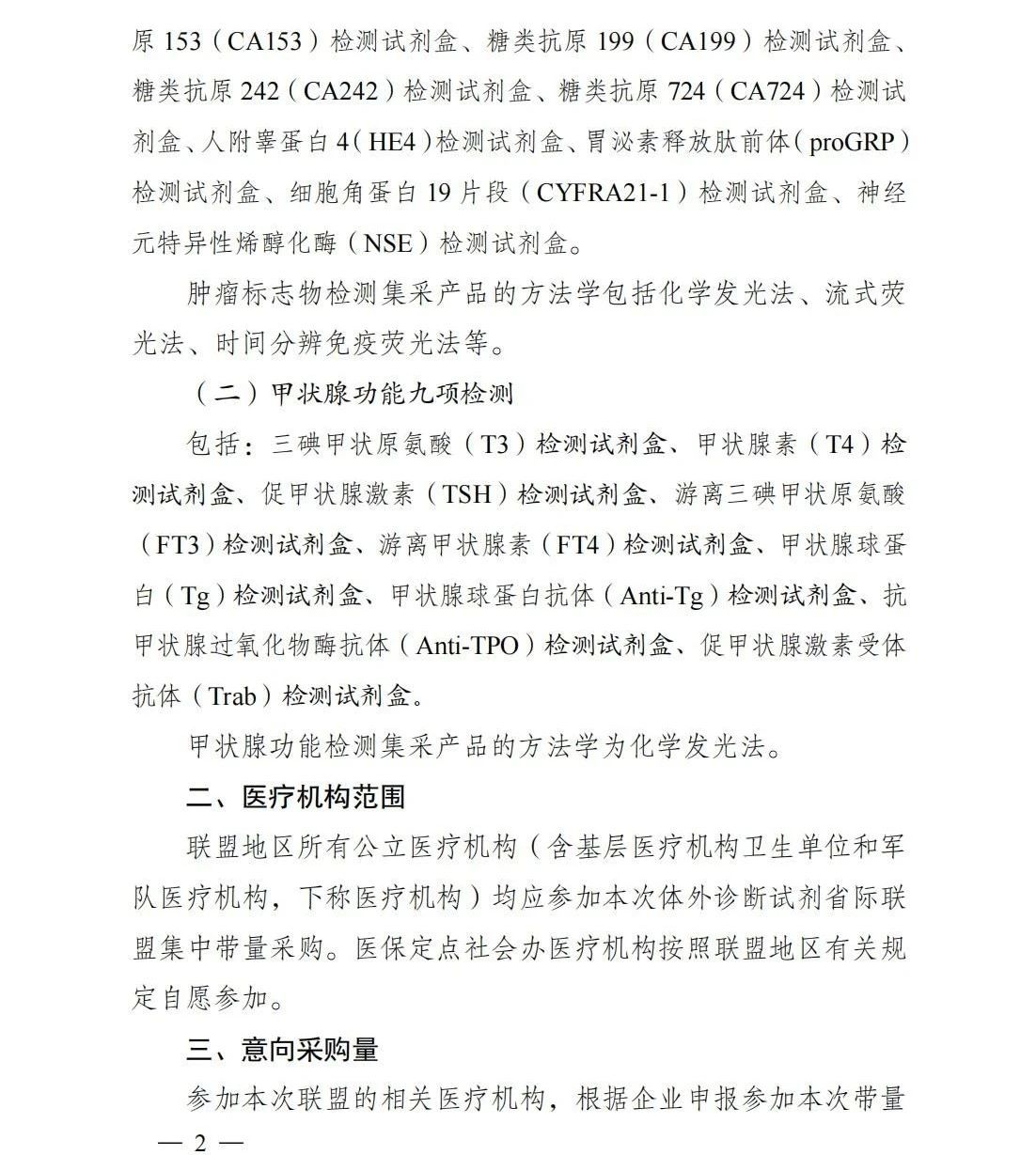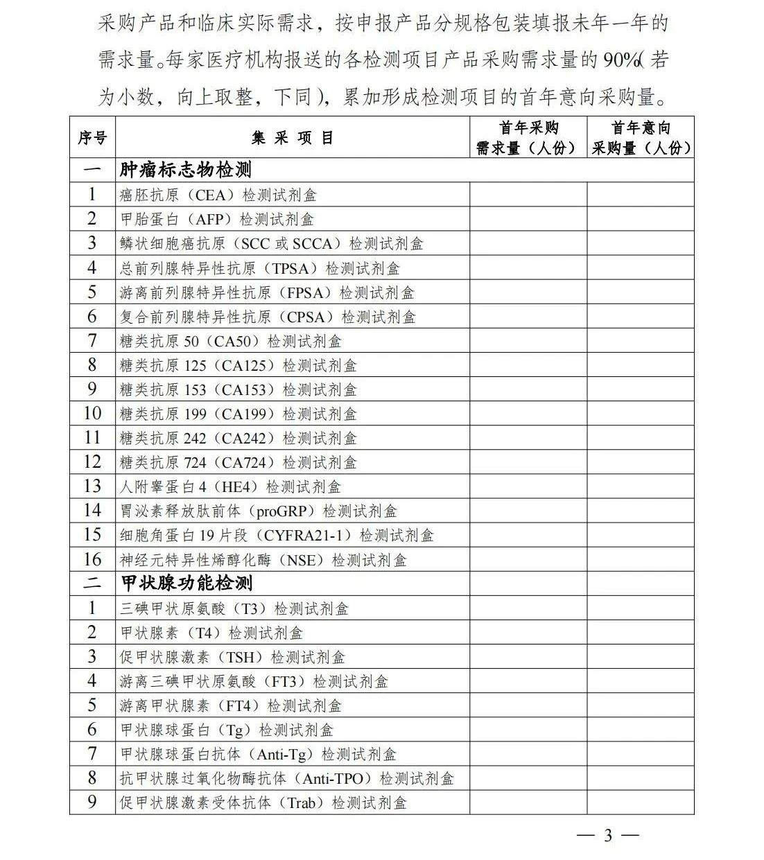 此次集采周期兩年,采購品種包括腫瘤標志物檢測產品十六項(化學發光法、流式熒光法、時間分辨免疫熒光法等)與甲狀腺功能檢測產品九項(化學發光法),具體如下: