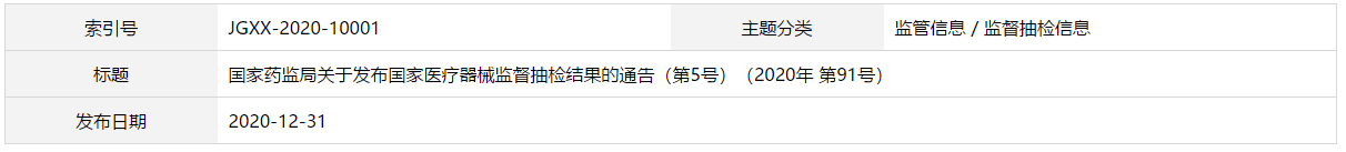 國家藥監局關于發布國家醫療器械監督抽檢結果的通告(第5號)(2020年 第91號)