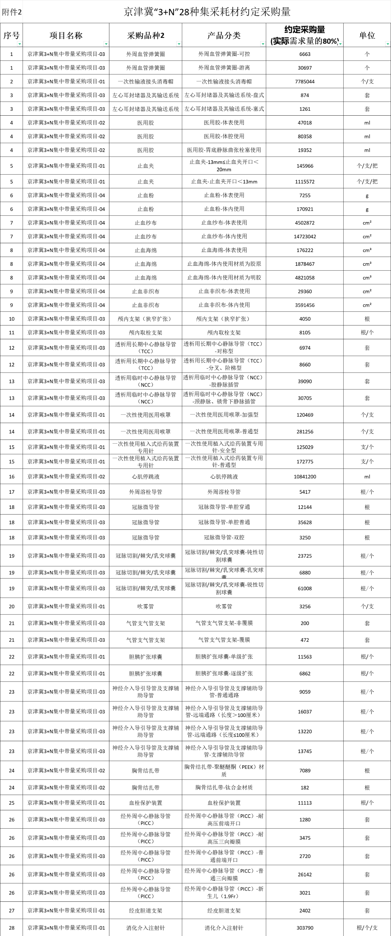 聯(lián)盟采購共包含28類耗材:外周血管彈簧圈、一次性輸液接頭消毒帽、左心耳封堵器及其輸送系統(tǒng)、醫(yī)用膠、止血夾、止血粉、止血紗布、止血海綿、止血非織布、顱內支架(狹窄擴張)、顱內取栓支架、透析用長期中心靜脈導管(TCC)、透析用臨時中心靜脈導管(NCC)、一次性使用醫(yī)用喉罩、一次性使用植入式給藥裝置專用針、心肌停跳液、外周溶栓導管、冠脈微導管、冠脈切割/棘突/乳突球囊、吹霧管、氣管支氣管支架、膽胰擴張球囊、神經介入導引導管及支撐輔助導管、胸骨結扎帶、血栓保護裝置、經外周中心靜脈導管(PICC)、經皮膽道支架、消化介入注射針。