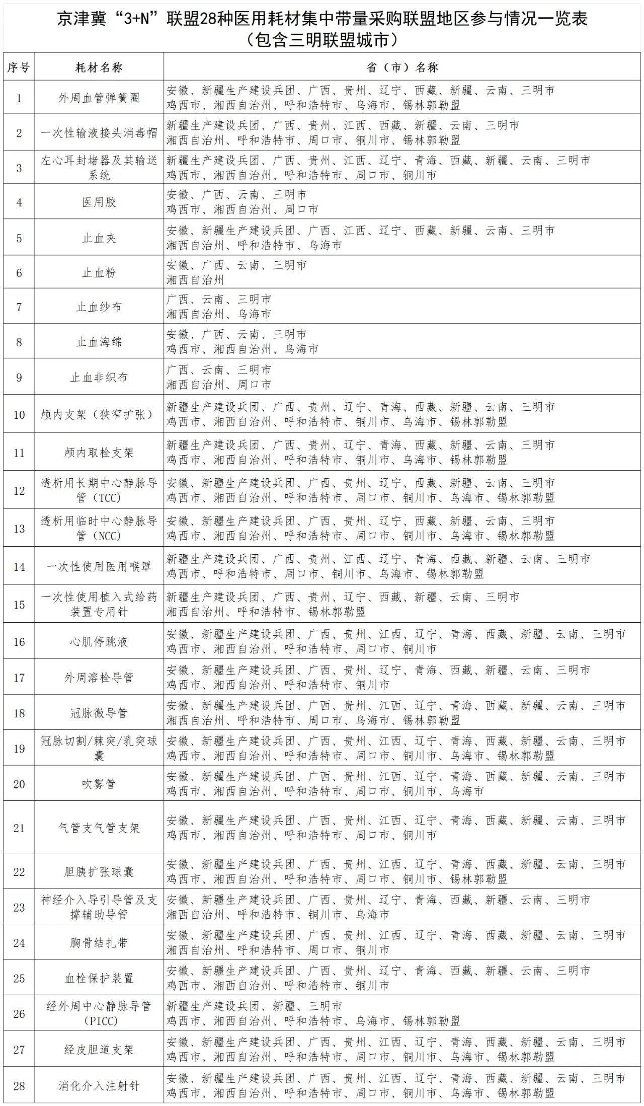 2023年12月28日,福建省三明聯(lián)盟城市官宣加入京津冀“3+N”聯(lián)盟28種醫(yī)用耗材集采,現(xiàn)階段聯(lián)盟地區(qū)一覽表如下: