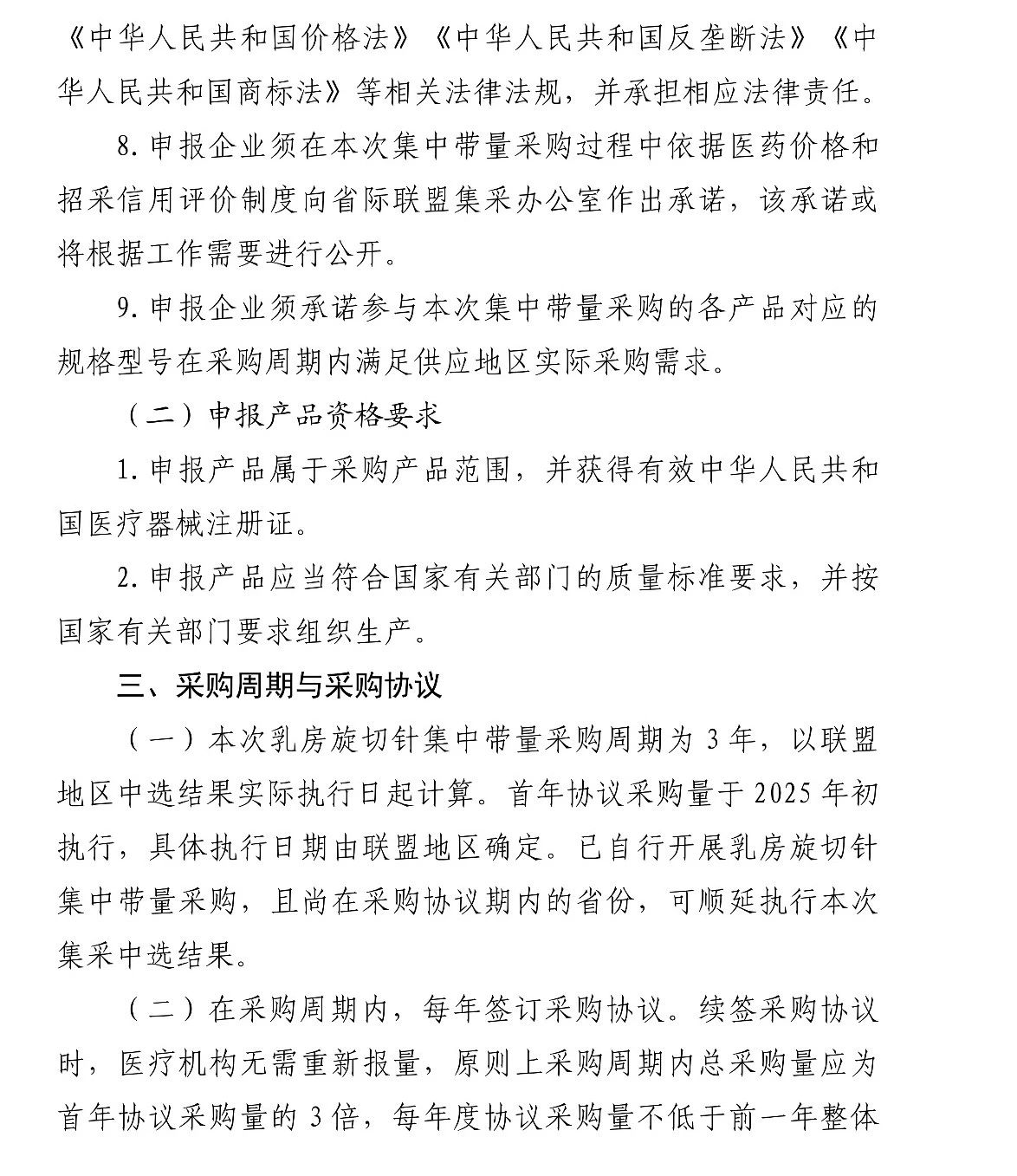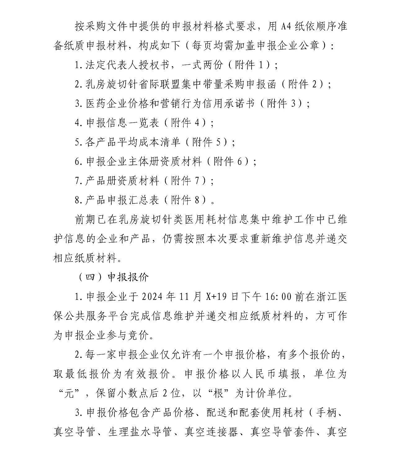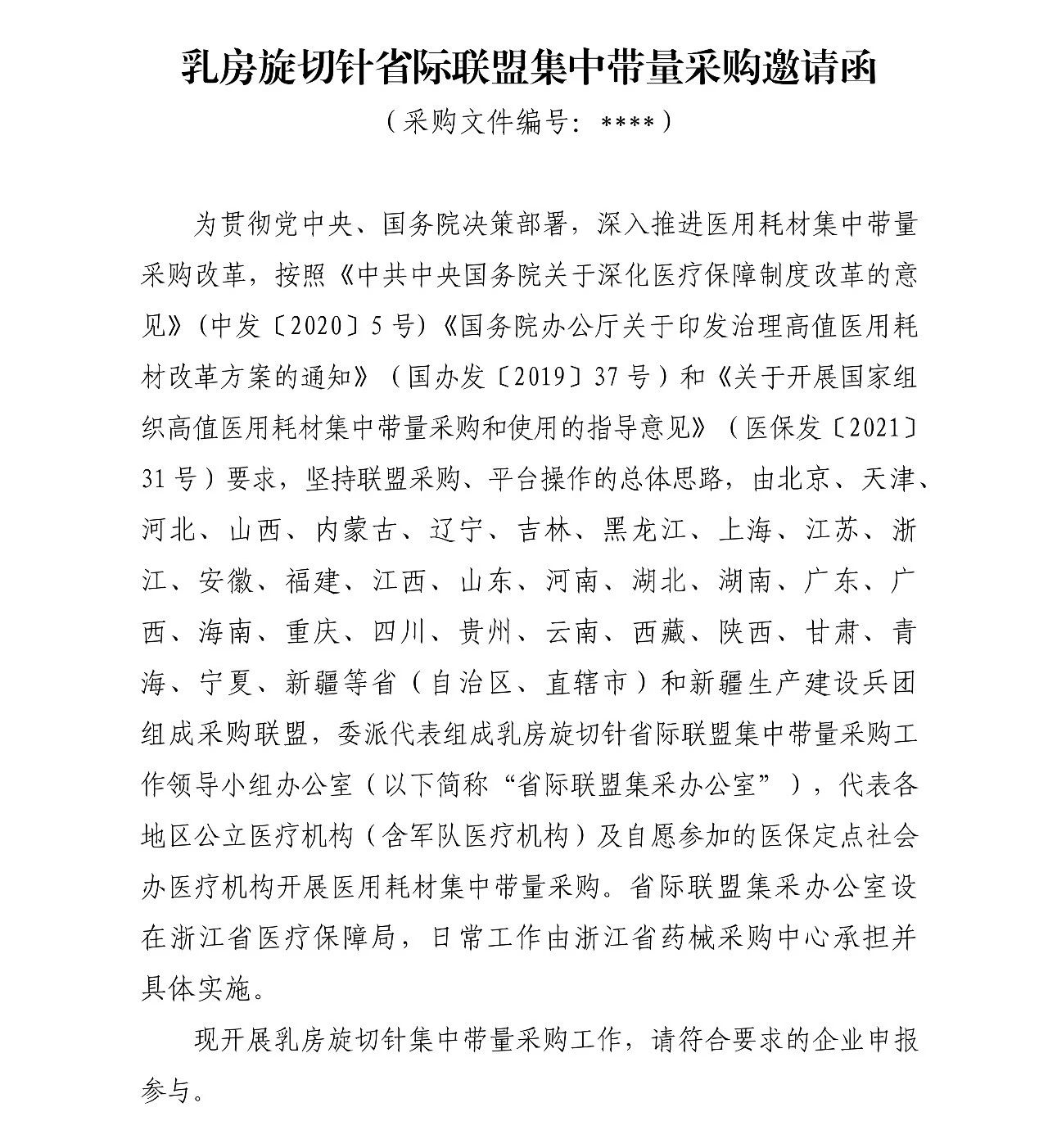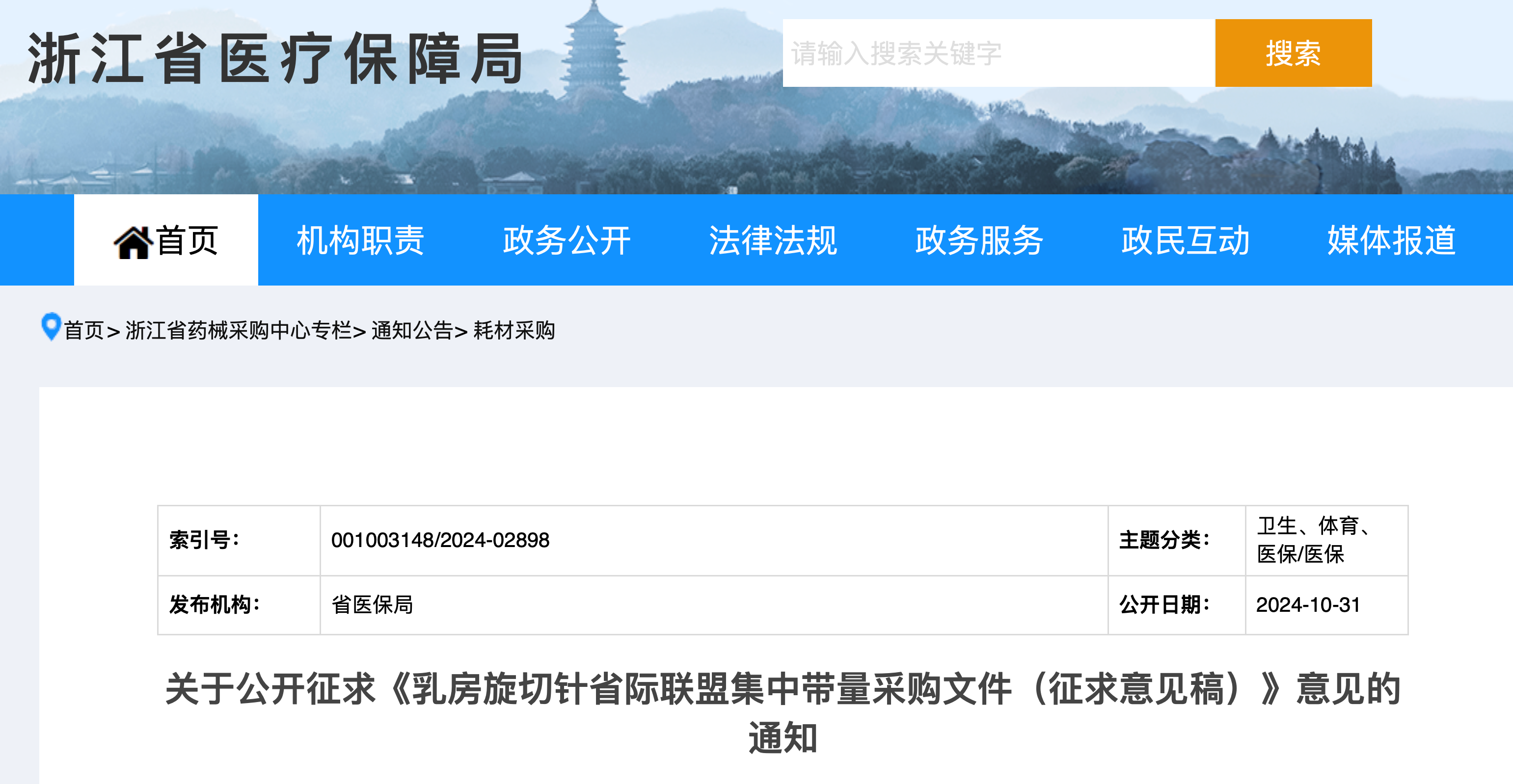 10月31日,浙江省就《乳房旋切針省際聯(lián)盟集中帶量采購文件(征求意見稿)》(全文見文末)公開征求意見,征求意見時間截止到11月6日。