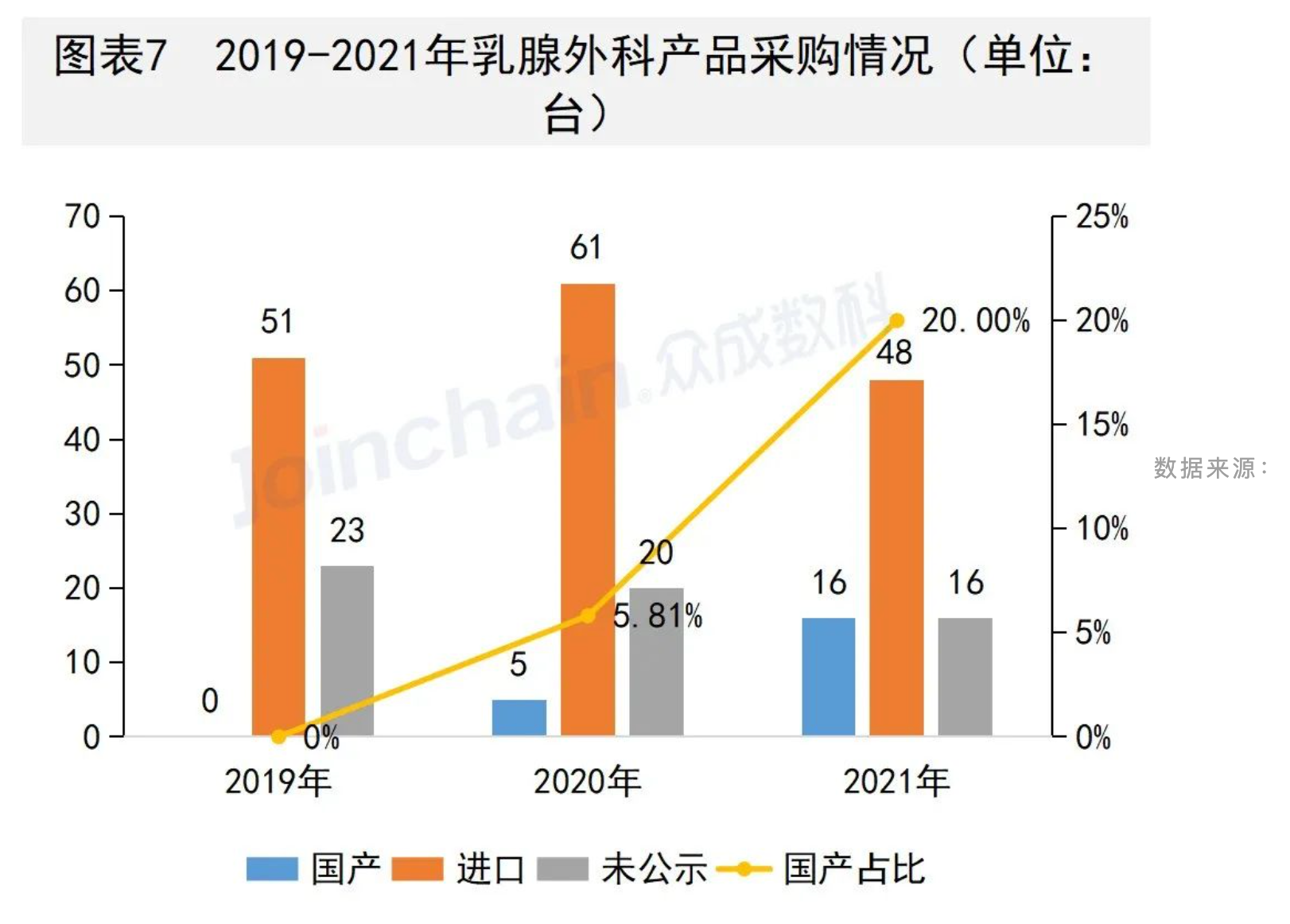 據(jù)眾成數(shù)科統(tǒng)計,2019-2021年國內(nèi)醫(yī)院端手術(shù)動力裝置乳腺外科產(chǎn)品(乳房旋切與活檢系統(tǒng))采購數(shù)量共計240件。近兩年,國產(chǎn)品牌開始發(fā)力,2020年國產(chǎn)產(chǎn)品實現(xiàn)零突破,2021年采購數(shù)量增加至16件,國產(chǎn)產(chǎn)品市場占比提升至20.00%。