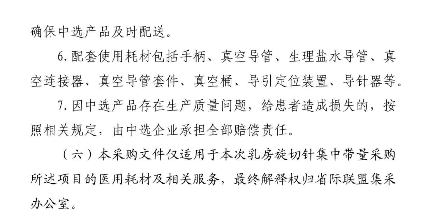 采購品種為乳房旋切針(包括但不限于國家醫(yī)療保障局醫(yī)保醫(yī)用耗材分類代碼為 C01040102600002 開頭的產(chǎn)品)。