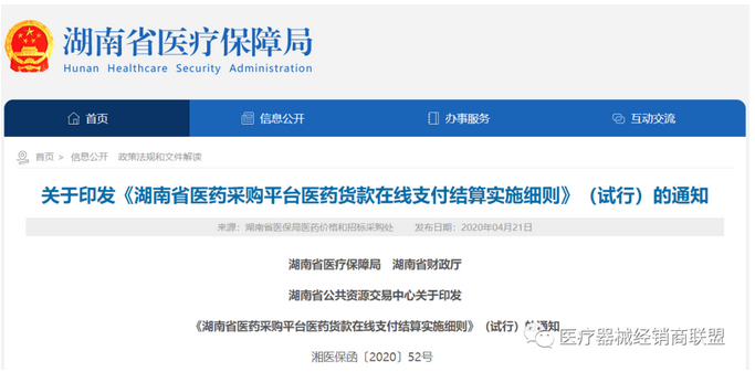 (4月21日),湖南省醫(yī)療保障局、湖南省財(cái)政廳以及湖南省公共資源交易中心聯(lián)合印發(fā)了《湖南省醫(yī)藥采購平臺(tái)醫(yī)藥貸款在線支付結(jié)算實(shí)施細(xì)則》(試行)的通知(以下簡稱《通知》)。