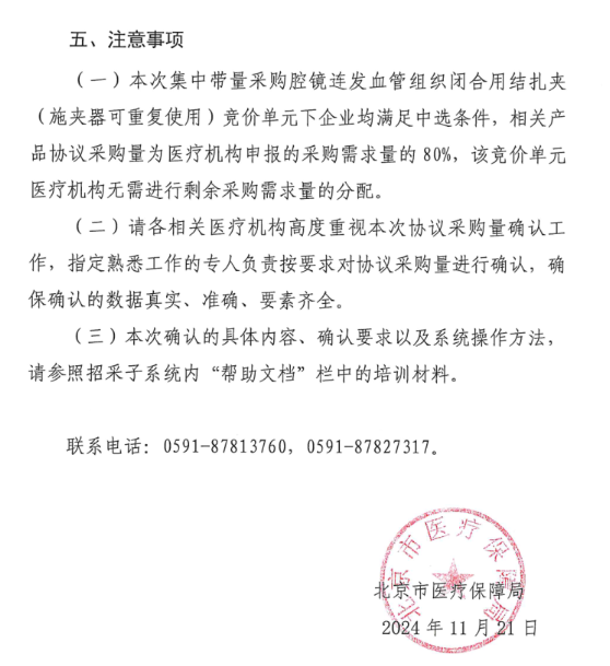 今日(11月21日),北京市醫(yī)保局發(fā)布《北京市醫(yī)療保障局關(guān)于開展血管組織閉合用結(jié)扎夾類醫(yī)用耗材協(xié)議采購(gòu)量確認(rèn)工作的通知》(附文末),開展結(jié)扎夾集采的協(xié)議采購(gòu)量確認(rèn)工作。