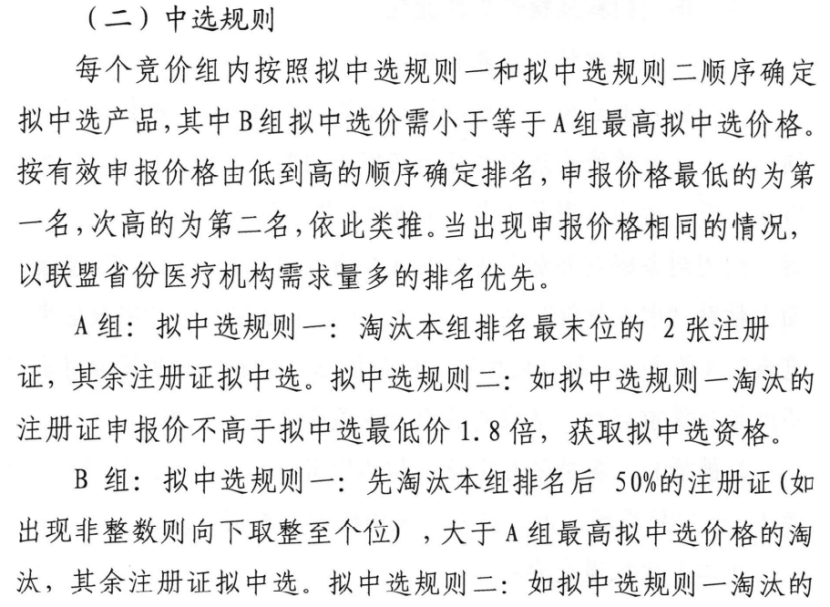 A組淘汰本組排名最末位的2張注冊證,其余注冊證擬中選。如擬中選規(guī)則一淘汰的注冊證申報價不高于擬中選最低價1.8倍,獲取擬中選資格。B組先淘汰本組排名后50%的注冊證,大于A組最高擬中選價格的淘汰,其余注冊證擬中選。如擬中選規(guī)則一淘汰的注冊證申報價不高于A組擬中選平均價0.8倍,獲取擬中選資格。