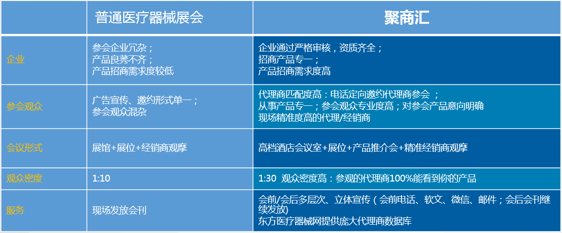 聚商匯是由東方醫療器械網(www.qxw18.com)運營的線下招商平臺,該平臺立足于為國內醫械全行業生產/經銷型企業產品招商,以及專業領域的品牌推介需求提供精準服務。