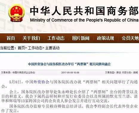 來自商務(wù)部的消息,5月8日,中國外資協(xié)會(huì)與國務(wù)院醫(yī)改辦就“兩票制”相關(guān)問題舉行了溝通會(huì)。