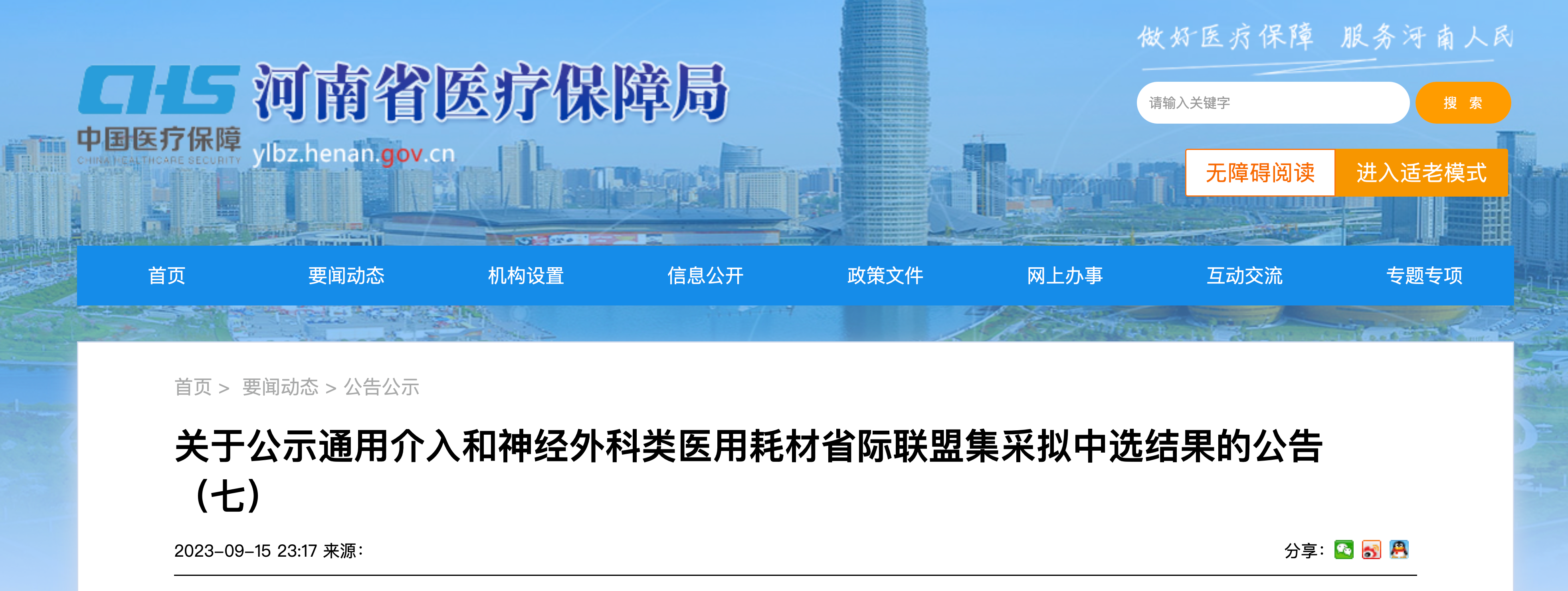 9月15日,河南省醫保局官網公布《關于公示通用介入和神經外科類醫用耗材省際聯盟集采擬中選結果的公告(七)》。