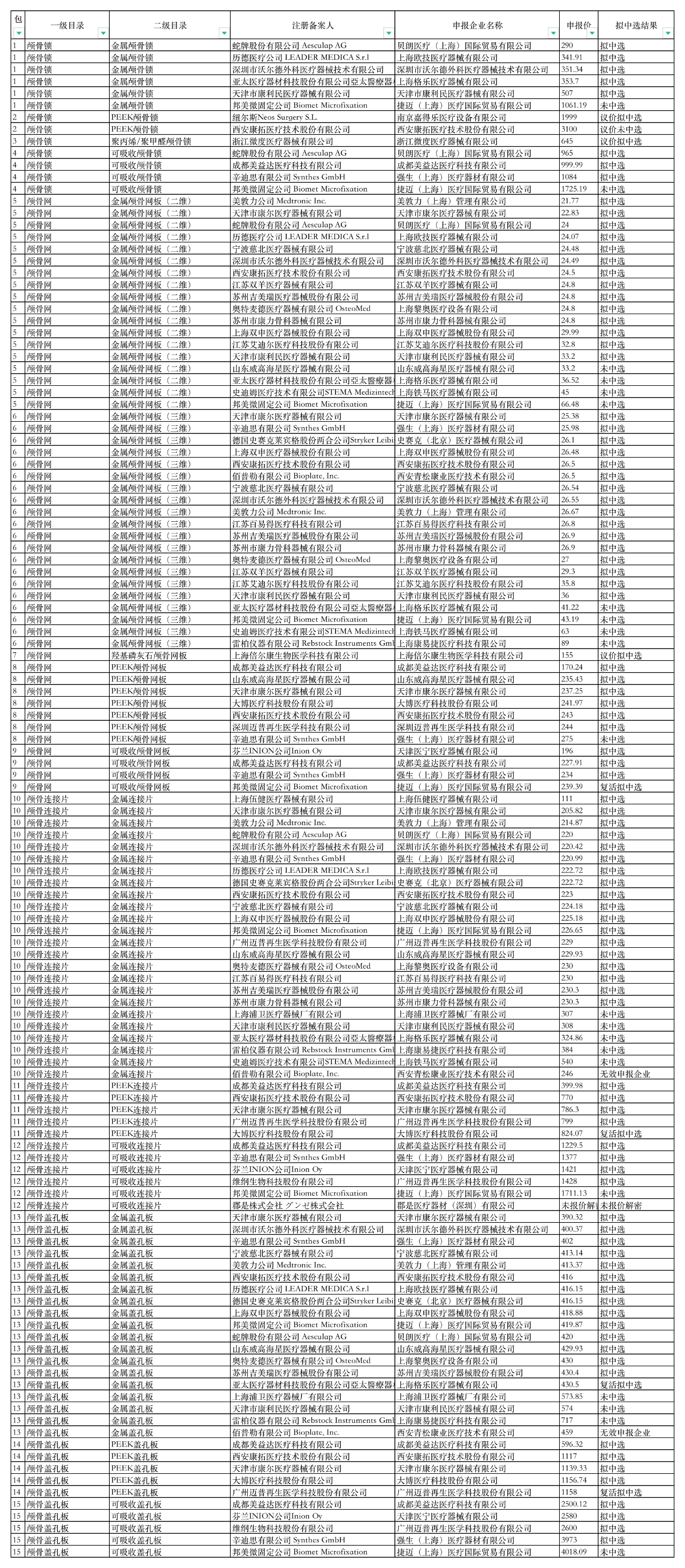 南京嘉得樂醫療設備有限公司的PEEK顱骨鎖、浙江微度醫療器械有限公司的聚丙烯/聚甲醛顱骨鎖、上海倍爾康生物醫學科技有限公司的羥基磷灰石顱骨網板都是通過議價獲取的擬中選資格。