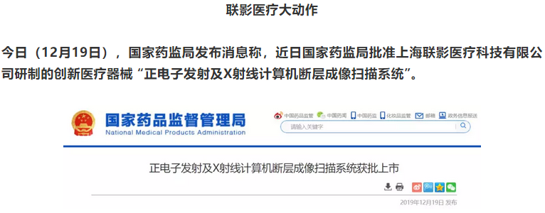 今日(12月19日),國家藥監(jiān)局發(fā)布消息稱,近日國家藥監(jiān)局批準(zhǔn)上海聯(lián)影醫(yī)療科技有限公司研制的創(chuàng)新醫(yī)療器械 “正電子發(fā)射及X射線計算機斷層成像掃描系統(tǒng)”。