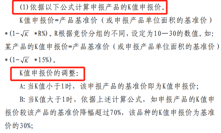 本次聯盟采購引入了“K值”概念:K值為申報產品的基準價(或申報產品單位面積的基準價)除以同類所有申報產品基準價(或申報產品單位面積的基準價)的最低值得到的數值(向下取整,保留三位小數)。