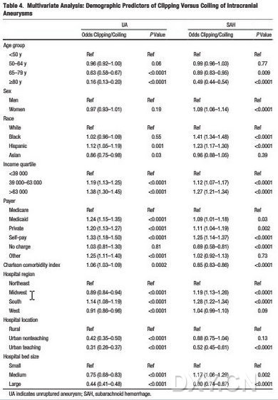 研究結(jié)果表明:當(dāng)對(duì)比進(jìn)行SAH治療的患者時(shí)發(fā)現(xiàn),進(jìn)行未破裂顱內(nèi)動(dòng)脈瘤治療者女性居多(75.0% 對(duì)比69.0%; P<0.0001)。總的,9.7%接受SAH治療的是自費(fèi)患者,而3%進(jìn)行未破裂動(dòng)脈瘤治療的是自費(fèi)患者(P<0.0001);62.2%接受SAH治療的是白種人,而76.4%進(jìn)行未破裂顱內(nèi)動(dòng)脈瘤治療的是白種人(P<0.0001);黑人、拉美裔和亞洲患者在接受SAH治療組中所占比例較高,相對(duì)而言,在未破裂顱內(nèi)動(dòng)脈瘤治療組中所占比例較低(他們的P<0.0001)