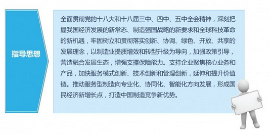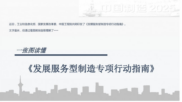 為貫徹落實《中國制造2025》,近日,工業(yè)和信息化部會同國家發(fā)展改革委、中國工程院制訂并印發(fā)了《發(fā)展服務(wù)型制造專項行動指南》(工信部聯(lián)產(chǎn)業(yè)〔2016〕231號,簡稱《指南》),工業(yè)和信息化部產(chǎn)業(yè)政策司負(fù)責(zé)人表示,《指南》是《中國制造2025》1+X體系的一個重要組成部分,其中“1”指的是《中國制造2025》,是我國未來十年制造強(qiáng)國建設(shè)的行動綱領(lǐng);“X”指的是11個指南,是實施《中國制造2025》的細(xì)化配套措施。