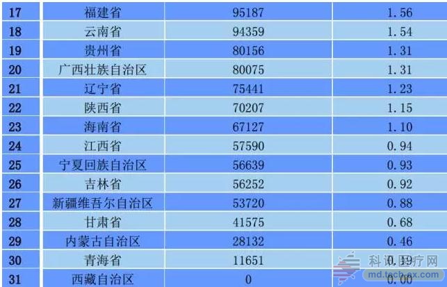2016年,全國醫療器材類商品銷售總額約為611億元。廣東、山東為前兩大醫療器材銷售大省,北京、浙江、河南、江蘇、重慶、上海、湖北、安徽也進入了區域銷售額排行榜的前10名。