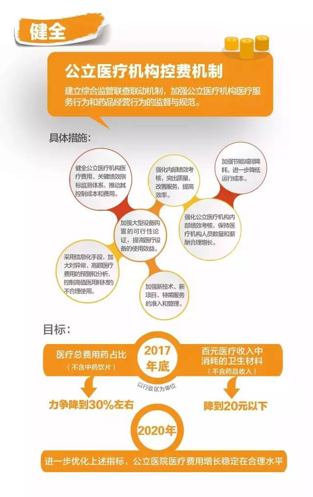 到2017年底,以行政區為單位,公立醫院藥占比(不含中藥飲片)力爭降到30%左右,百元醫療收入(不含藥品收入)中消耗的衛生材料降到20元以下;到2020年上述指標得到進一步優化,公立醫院醫療費用增長穩定在合理水平。