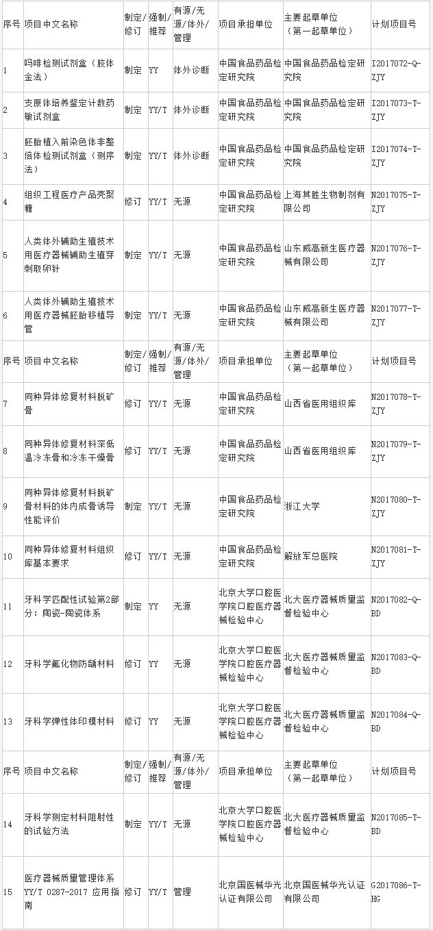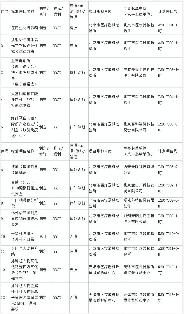 總局印發2017年醫療器械行業標準制修訂項目