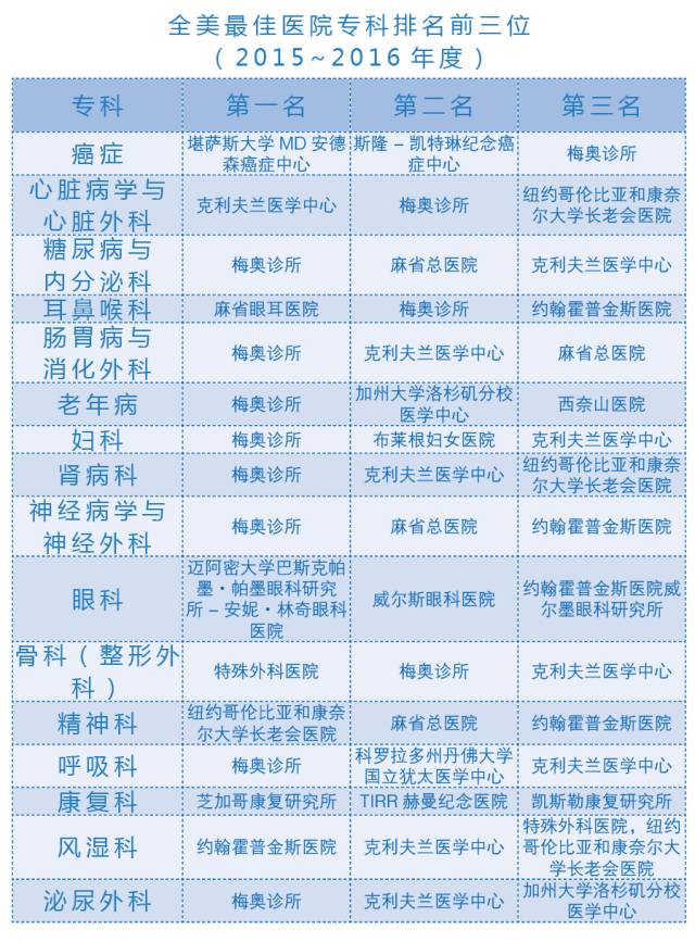 2015年全美最佳醫(yī)院排行榜Top15:專科強才是真的強!