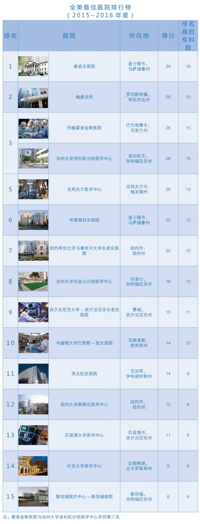 在2015~2016年度的全美最佳醫(yī)院排行榜中,137家醫(yī)院——不足全美醫(yī)療機構(gòu)總數(shù)的3%——成功在至少一個專科領(lǐng)域進入最佳排名榜單。而至少在6個專科領(lǐng)域進入全美前20名的醫(yī)院,才能在綜合榜單上占有一席之地。今年,共15家醫(yī)院成功登榜。