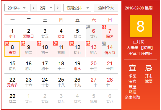 根據(jù)國(guó)家規(guī)定,北京華康普美2016年春節(jié)放假安排如下:2016年2月7日至2016年2月13日放假,共7天。春節(jié)前2月6日(星期六)上班,春節(jié)后2月14日(星期日)正常上班。