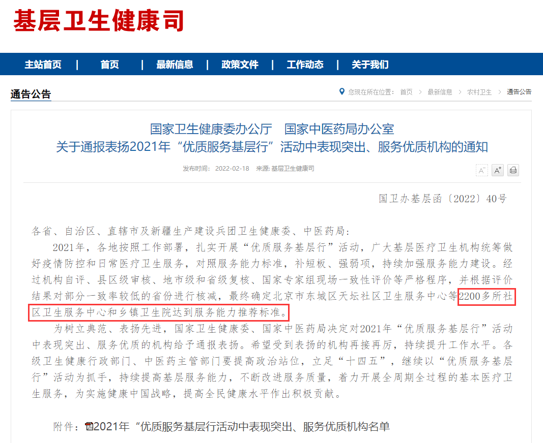 近日,國家衛健委、國家中醫藥局聯合發表關于通報表揚2021年“優質服務基層行”活動中表現突出、服務優質機構的通知。