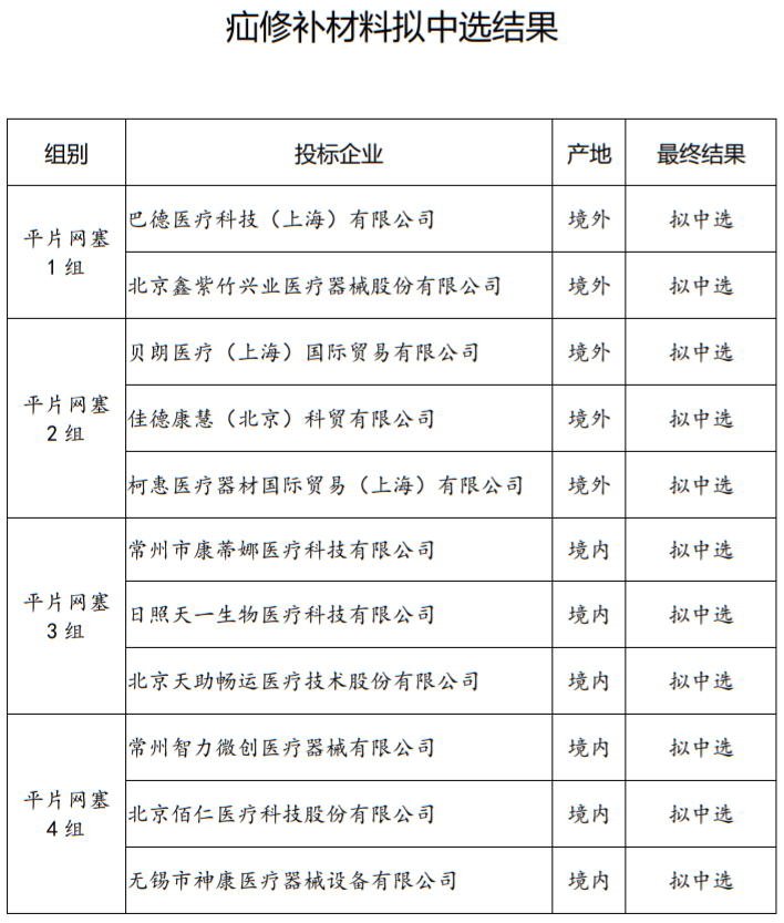 疝修補材料擬中選結果涉及巴德醫療、貝朗醫療、柯惠醫療等11家械企,在此之前,共26家械企符合申報條件。