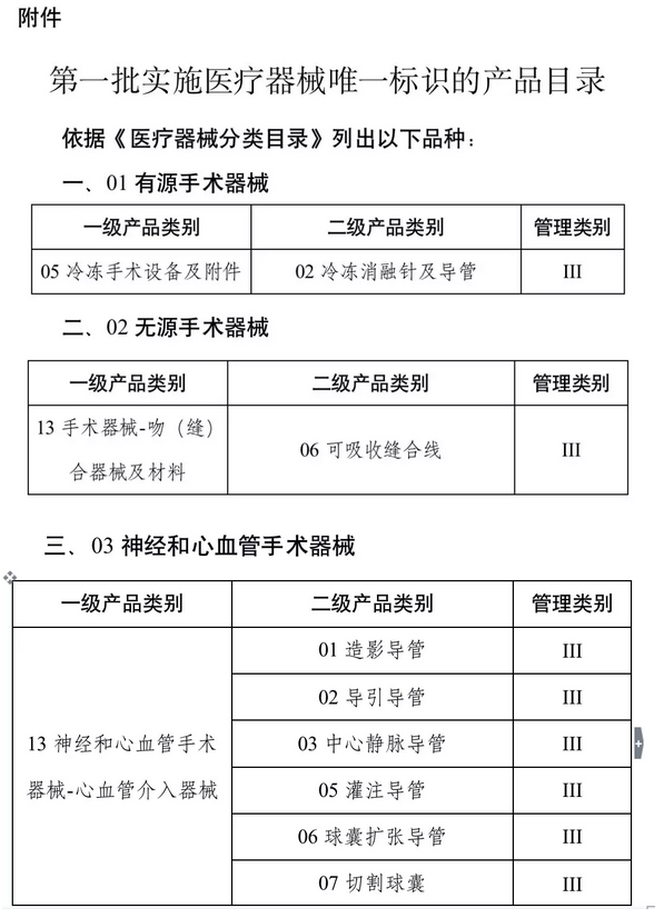 心臟起搏器、髖關節假體、整形用注射填充物等九大類64個品種被列入第一批實施醫療器械唯一標識的產品目錄,(具體產品目錄文末見附件)。