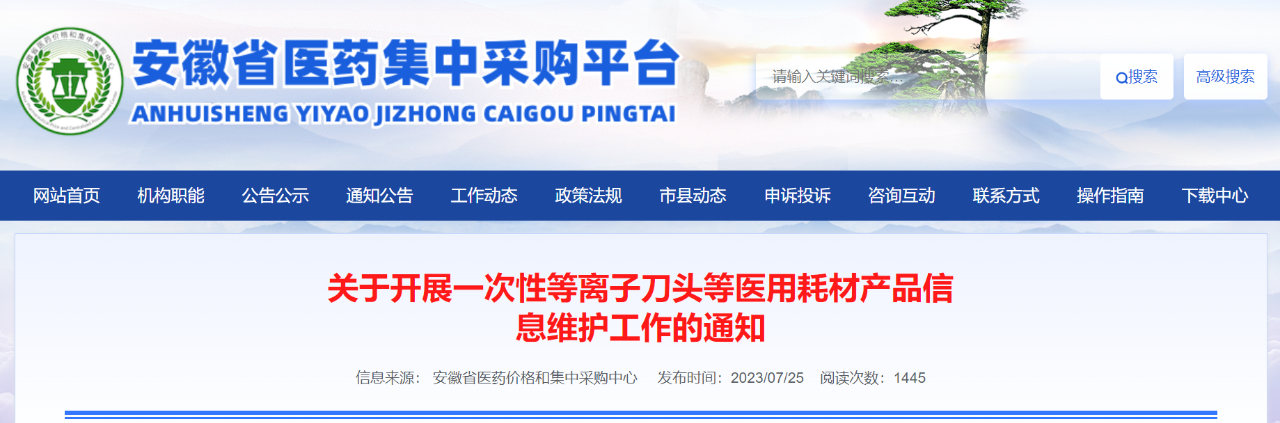 近日,安徽省醫藥價格和集中采購中心發布《關于開展一次性等離子刀頭等醫用耗材產品信息維護工作的通知》(簡稱《通知》)。