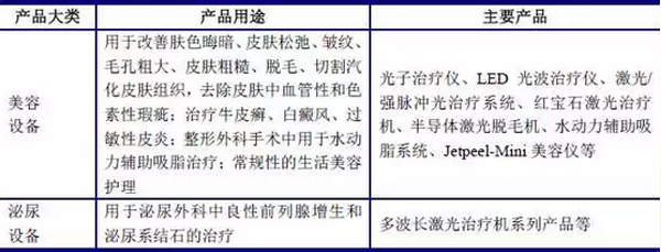 公司主要從事激光和其他光電類醫(yī)療及美容設(shè)備研發(fā)、生產(chǎn)、銷售和代理,向用戶提供多種激光和其他光電類醫(yī)療及美容解決方案,主要產(chǎn)品包括面向美容和泌尿外科等領(lǐng)域的激光和其他光電類醫(yī)療及美容設(shè)備。