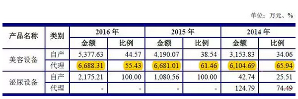 公司最早做醫(yī)療美容設(shè)備的代理起家,通過(guò)代理品牌產(chǎn)品積累渠道和客戶資源,隨著國(guó)內(nèi)產(chǎn)業(yè)技術(shù)和產(chǎn)業(yè)配套的成熟,建立自己的研發(fā)生產(chǎn)團(tuán)隊(duì),從技術(shù)門檻相對(duì)較低的產(chǎn)品線做起,利用現(xiàn)有的銷售渠道去實(shí)現(xiàn)銷售,暫且不與代理產(chǎn)品發(fā)生直接競(jìng)爭(zhēng),去做增量的低端市場(chǎng);隨著品牌、技術(shù)、工藝的積累,不斷優(yōu)化產(chǎn)品線,促使自有產(chǎn)品的附加值提升,對(duì)上游主要供應(yīng)商的依賴減小;在收入結(jié)構(gòu)中,自產(chǎn)產(chǎn)品的收入貢獻(xiàn)不斷提升,甚至超過(guò)代理品牌。