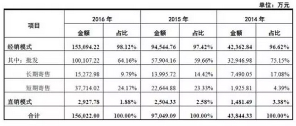 報(bào)告期內(nèi)公司銷售收入主要來(lái)源于經(jīng)銷模式業(yè)務(wù)收入,占比分別為96.62%、97.42%和98.12%。