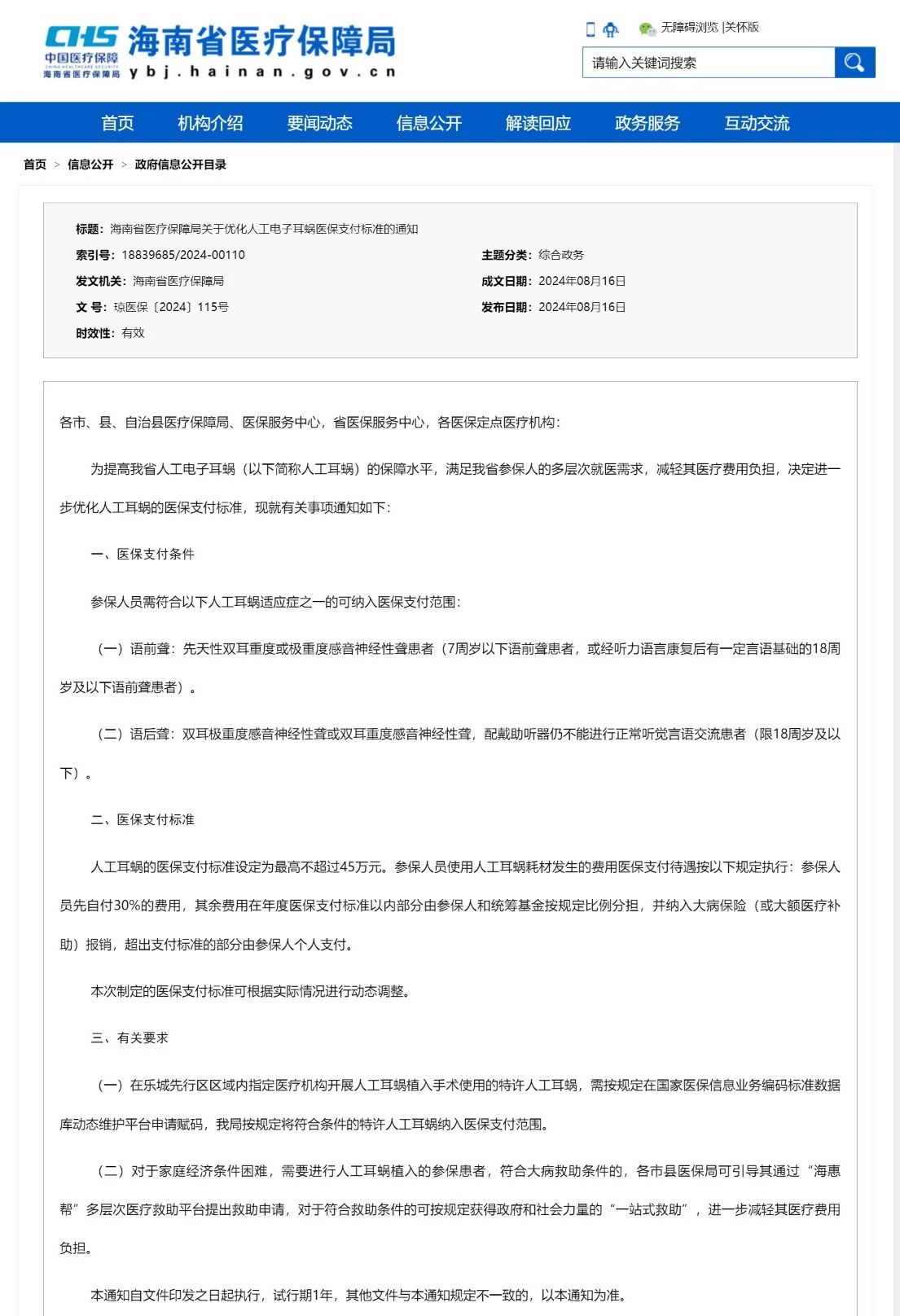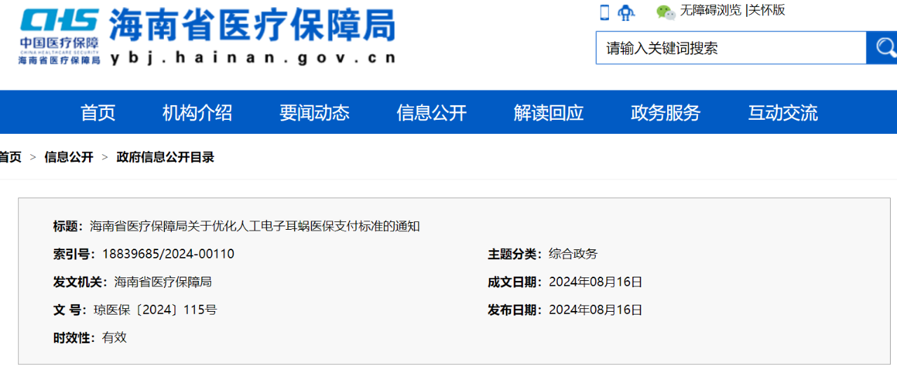 近日,海南醫(yī)保局發(fā)布《關(guān)于優(yōu)化人工電子耳蝸醫(yī)保支付標(biāo)準(zhǔn)的通知》(完整見(jiàn)文末),自印發(fā)之日起執(zhí)行,試行期1年。