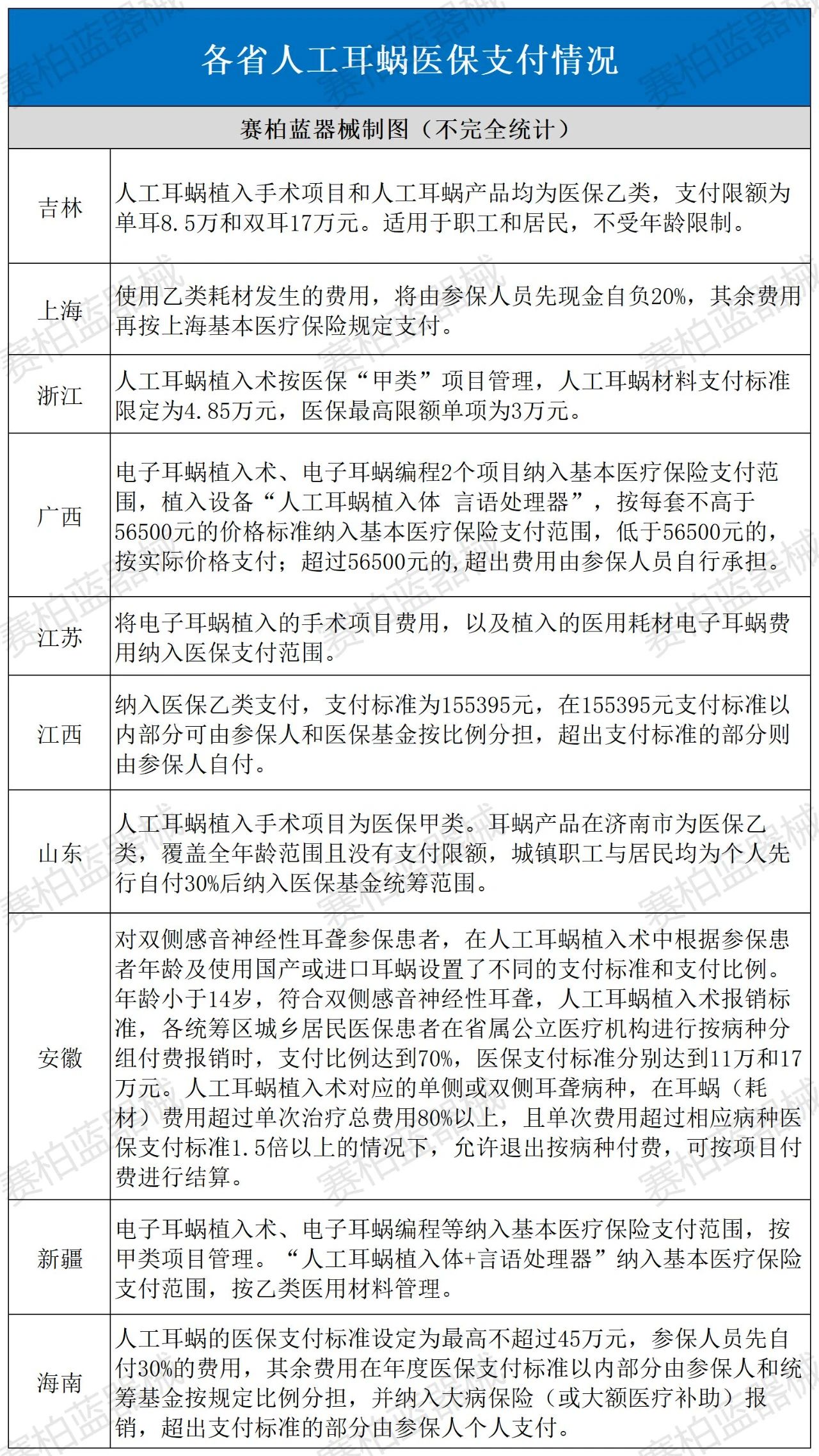 截至目前,吉林、上海、江蘇、浙江、安徽、福建、江西、山東、河南、廣東、廣西、新疆、海南等省份均已將人工耳蝸植入納入當(dāng)?shù)蒯t(yī)保報(bào)銷(xiāo)范圍,詳情如下: