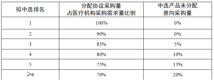 3、依據(jù)文件,同一競(jìng)價(jià)單元中選企業(yè)按中選排名順序,排名第一(競(jìng)價(jià)比價(jià)價(jià)格最低)的產(chǎn)品可獲得100%的意向采購(gòu)量,排名第二和第三的產(chǎn)品分別獲得90%和85%的意向采購(gòu)量,依此類推。