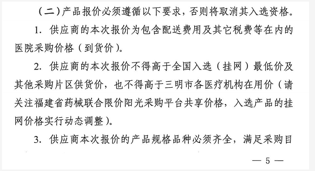 需要指出的是,在三明市2018年11月12日發(fā)布的關(guān)于價格評審細則的通知里,沒有再強調(diào)最低價中標,只說報價不得高于全國最低價以及醫(yī)療機構(gòu)在用價。