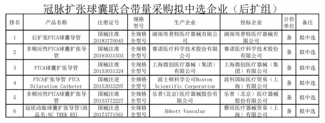 后擴組冠脈擴張球囊擬中選企業包括湖南埃普特、賽諾醫療、上海微創、波科、樂普、雅培。