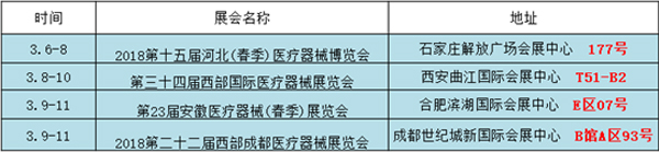 這四場展會分別是“2018第十五屆河北(春季)醫療器械博覽會”“第三十四屆西部國際醫療器械展覽會”“第23屆安徽醫療器械(春季)展覽會”以及“2018第二十二屆西部成都醫療器械展覽會”。詳情見下表。