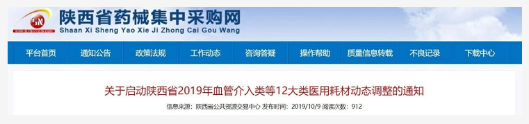 今日(10月9日),陜西省藥械集中采購網發布《關于啟動陜西省2019年血管介入類等12大類醫用耗材動態調整的通知》(下稱《通知》)。